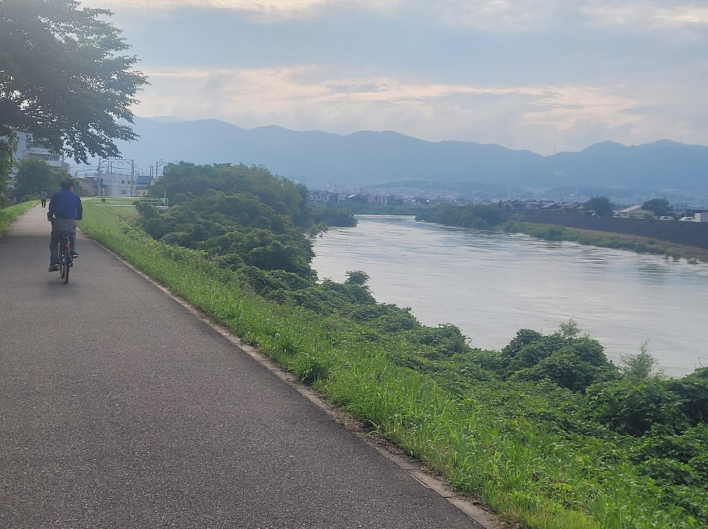 A lesser-known cycling route is the Yamashina-Uji Intersection, a term I coined to describe the point at which the Uji River splits in two, its other half forming the beginning of the Yamashina River. This route is located near my brother’s home in Mukaijima, and just parallel to Kangetsukyo Station on the Keihan Line. Beautiful mountainous backdrops and wide flowing waters surrounded by thick greenery are sure to give the mind a sense of peace and serenity.