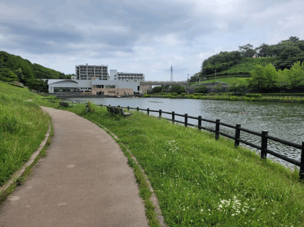 Fukuoka Kenei Central Park features a serene walkway that loops around the Konpira Pond. There’s not much information online about this particular pond, but I know from my own experience that there was an ocean scent in the air. In any case, the park has some of the most lush green forests and grass I’ve seen in Japan, and it’s also a popular fishing spot among the locals.