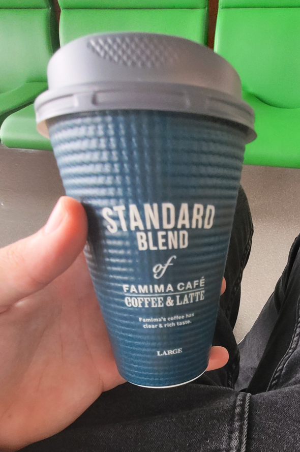 A sturdy takeaway cup with a patterned texture for a strong grip, I’ll never forget sipping on this hot and soothing FAMIMA CAFÉ beverage while gazing out at the planes taking off.