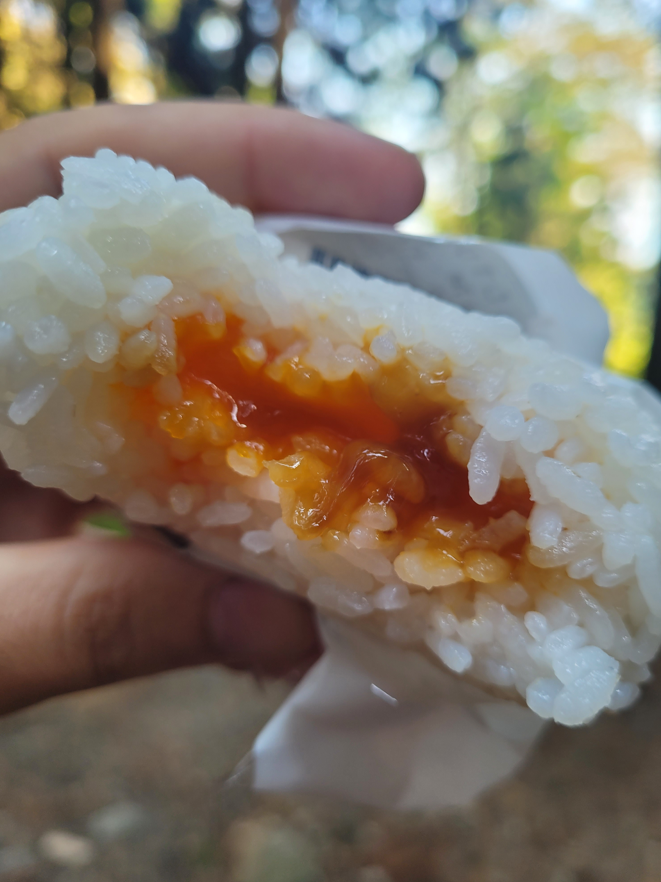 The combination of rice and gooey egg yolk make for a compact easy-to-carry hit of carbs and protein in one go.