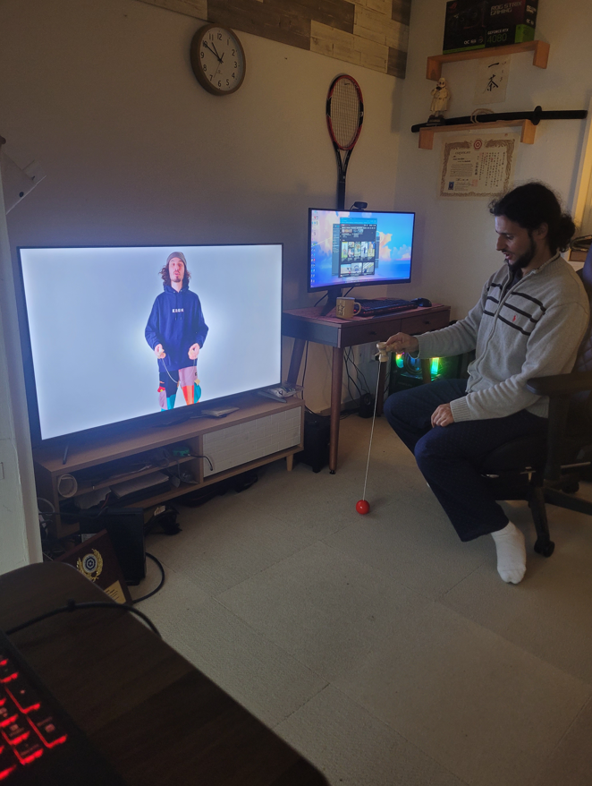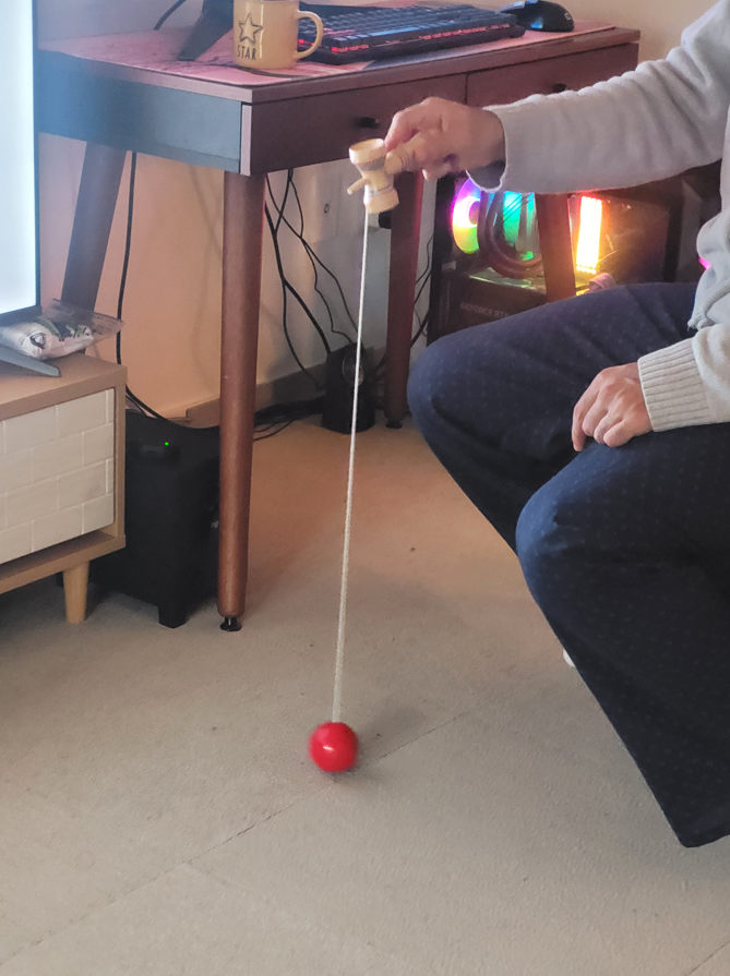 Kendama is a simple game that requires the player to swing the ball and try to land it in either the cups or on the sword.